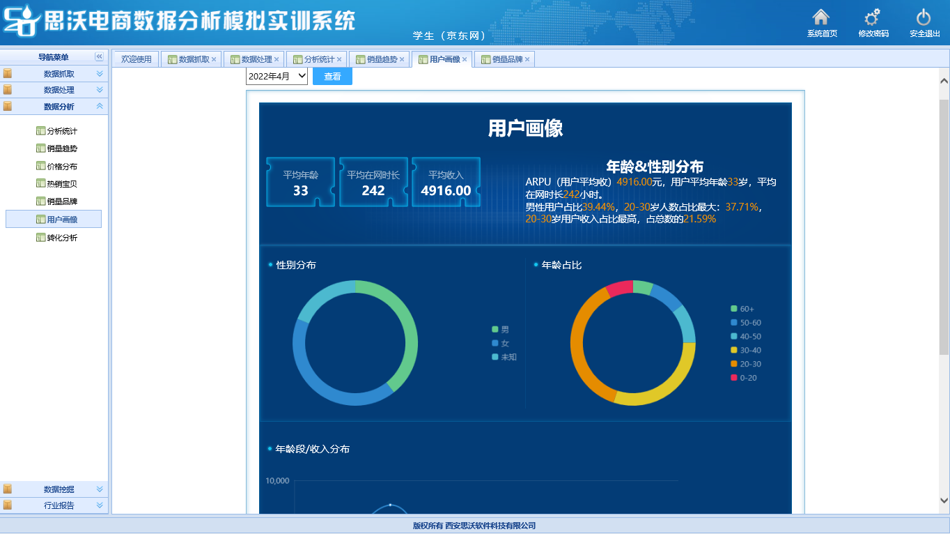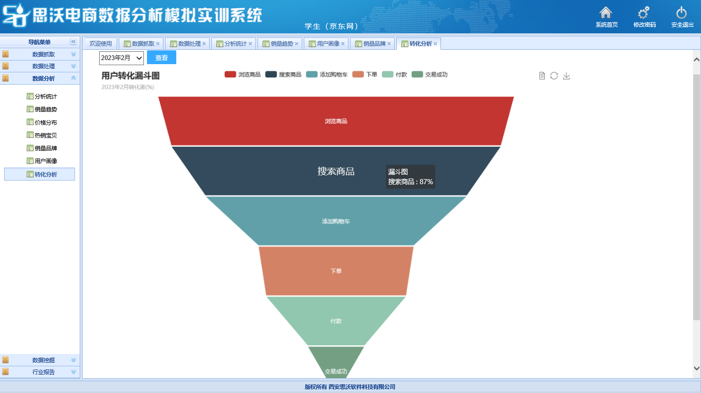 當前大數(shu)(shu)(shu)據(ju)(ju)(ju)(ju)(ju)和數(shu)(shu)(shu)據(ju)(ju)(ju)(ju)(ju)化(hua)運營(ying)(ying)的(de)(de)概念早已(yi)深入(ru)人(ren)心,數(shu)(shu)(shu)據(ju)(ju)(ju)(ju)(ju)分(fen)(fen)析已(yi)經成為(wei)電(dian)(dian)(dian)商(shang)(shang)(shang)(shang)從(cong)業人(ren)員(yuan)不可(ke)(ke)或(huo)缺的(de)(de)一項技能。《思沃電(dian)(dian)(dian)商(shang)(shang)(shang)(shang)數(shu)(shu)(shu)據(ju)(ju)(ju)(ju)(ju)分(fen)(fen)析模(mo)(mo)擬(ni)(ni)實(shi)(shi)訓系(xi)統(tong)》就(jiu)(jiu)是根(gen)據(ju)(ju)(ju)(ju)(ju)當前電(dian)(dian)(dian)子商(shang)(shang)(shang)(shang)務(wu)行(xing)業發(fa)展,通過真(zhen)實(shi)(shi)模(mo)(mo)擬(ni)(ni)電(dian)(dian)(dian)商(shang)(shang)(shang)(shang)運營(ying)(ying)平臺(tai)環(huan)境(jing),幫助學生(sheng)掌握電(dian)(dian)(dian)商(shang)(shang)(shang)(shang)數(shu)(shu)(shu)據(ju)(ju)(ju)(ju)(ju)分(fen)(fen)析技能的(de)(de)教(jiao)學平臺(tai)軟(ruan)件。隨(sui)著(zhu)市場(chang)規(gui)模(mo)(mo)的(de)(de)普遍(bian)增加(jia)和業務(wu)規(gui)模(mo)(mo)的(de)(de)快(kuai)速增長(chang),電(dian)(dian)(dian)商(shang)(shang)(shang)(shang)業務(wu)流程開始變得復雜(za), 涉及(ji)的(de)(de)交(jiao)易數(shu)(shu)(shu)據(ju)(ju)(ju)(ju)(ju)量將繼續增加(jia)。為(wei)了在激(ji)烈(lie)的(de)(de)市場(chang)競(jing)爭中(zhong)脫穎(ying)而(er)出(chu),許多(duo)電(dian)(dian)(dian)商(shang)(shang)(shang)(shang)公司都會(hui)設立專(zhuan)門的(de)(de)崗位和人(ren)員(yuan),及(ji)時了解廣告、產品價格和銷(xiao)售數(shu)(shu)(shu)據(ju)(ju)(ju)(ju)(ju),并(bing)根(gen)據(ju)(ju)(ju)(ju)(ju)競(jing)爭產品 的(de)(de)產品和營(ying)(ying)銷(xiao)策略進行(xing)調(diao)整。隨(sui)著(zhu)電(dian)(dian)(dian)商(shang)(shang)(shang)(shang)領域穩步增長(chang),競(jing)爭日益激(ji)烈(lie),渠道精細化(hua)運營(ying)(ying)已(yi)然成為(wei)品牌突圍的(de)(de)重中(zhong)之重。 數(shu)(shu)(shu)據(ju)(ju)(ju)(ju)(ju)(和數(shu)(shu)(shu)據(ju)(ju)(ju)(ju)(ju)分(fen)(fen)析)對電(dian)(dian)(dian)商(shang)(shang)(shang)(shang)至關(guan)重要,通過海(hai)量數(shu)(shu)(shu)據(ju)(ju)(ju)(ju)(ju),店(dian)鋪運營(ying)(ying)人(ren)員(yuan)可(ke)(ke)以了解客戶的(de)(de)行(xing)為(wei)和偏好,也可(ke)(ke)以洞察(cha)同行(xing)業競(jing)爭對手的(de)(de)方向和動態,這就(jiu)(jiu)是了解自己、了解競(jing)爭對手。 《思沃電(dian)(dian)(dian)商(shang)(shang)(shang)(shang)數(shu)(shu)(shu)據(ju)(ju)(ju)(ju)(ju)分(fen)(fen)析模(mo)(mo)擬(ni)(ni)實(shi)(shi)訓系(xi)統(tong)》高(gao)度模(mo)(mo)擬(ni)(ni)京東(dong)(dong)(dong)網,真(zhen)實(shi)(shi)獲(huo)取海(hai)量京東(dong)(dong)(dong)真(zhen)實(shi)(shi)數(shu)(shu)(shu)據(ju)(ju)(ju)(ju)(ju),該教(jiao)學軟(ruan)件系(xi)統(tong)的(de)(de)從(cong)京東(dong)(dong)(dong)的(de)(de)各行(xing)業數(shu)(shu)(shu)據(ju)(ju)(ju)(ju)(ju)分(fen)(fen)析入(ru)手,系(xi)統(tong)展示在電(dian)(dian)(dian)子商(shang)(shang)(shang)(shang)務(wu)環(huan)境(jing)下進行(xing)運營(ying)(ying)數(shu)(shu)(shu)據(ju)(ju)(ju)(ju)(ju)分(fen)(fen)析的(de)(de)各種思路和方法。 能讓學生(sheng)快(kuai)速學會(hui)如何做電(dian)(dian)(dian)商(shang)(shang)(shang)(shang)數(shu)(shu)(shu)據(ju)(ju)(ju)(ju)(ju)分(fen)(fen)析,并(bing)能利用數(shu)(shu)(shu)據(ju)(ju)(ju)(ju)(ju)分(fen)(fen)析結果指導網店(dian)經營(ying)(ying)。