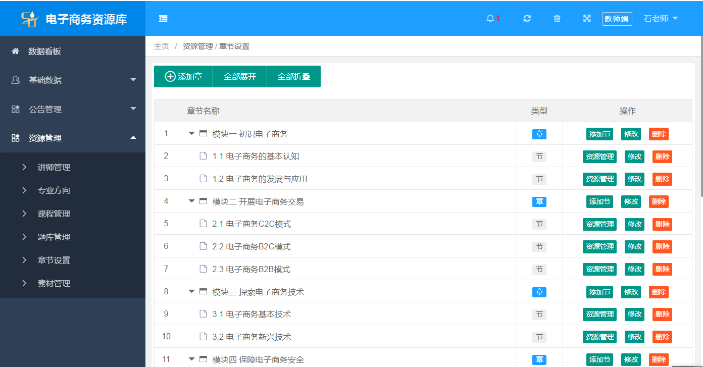 教師端(duan)的基(ji)礎數(shu)據(ju)包(bao)括(kuo)數(shu)據(ju)看(kan)板,基(ji)礎數(shu)據(ju),公告管(guan)(guan)理,資(zi)源管(guan)(guan)理。數(shu)據(ju)統(tong)(tong)計包(bao)括(kuo)班級統(tong)(tong)計,學生統(tong)(tong)計,專業方向(xiang),課程統(tong)(tong)計,講師統(tong)(tong)計,素(su)材統(tong)(tong)計,報表統(tong)(tong)計等。