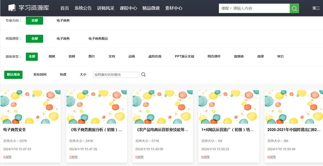 (2)支持(chi)按照專業(ye)方向、課程(cheng)名稱、素材類型(xing)、來源(yuan)等進行(xing)資源(yuan)分(fen)組,支持(chi)資源(yuan)的一(yi)站式智(zhi)能搜索。允許用(yong)戶(hu)按照資源(yuan)的專業(ye)方向、所屬課程(cheng)/欄目(mu)、媒體類型(xing)、主(zhu)題關鍵字等快速查(cha)找與統(tong)計(ji)。能夠按照發(fa)布時間、熱度、大小等對熱門資源(yuan)進行(xing)自動排序和統(tong)計(ji)。