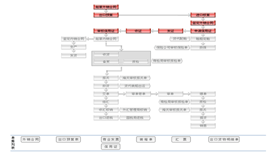 業務(wu)流(liu)程(cheng):CIF+L/C,CIF+/D/A,CIF+D/P,CIF+T/T Before shipment CIF+T/T After shipment FOB+L/C,FOB+/D/A,FOB+D/P,FOB+T/T Before shipment FOB+T/T After shipment CFR+L/C,CFR+/D/A,CFR+D/P,CFR+T/T Before shipment CFR+T/T After shipment 業務(wu)流(liu)程(cheng):在(zai)這里填(tian)寫和查(cha)看所需(xu)要的(de)單據(ju)(ju)。直接可在(zai)流(liu)程(cheng)圖中表現。查(cha)看的(de)單據(ju)(ju)分填(tian)寫的(de)單據(ju)(ju)和收到的(de)單據(ju)(ju)