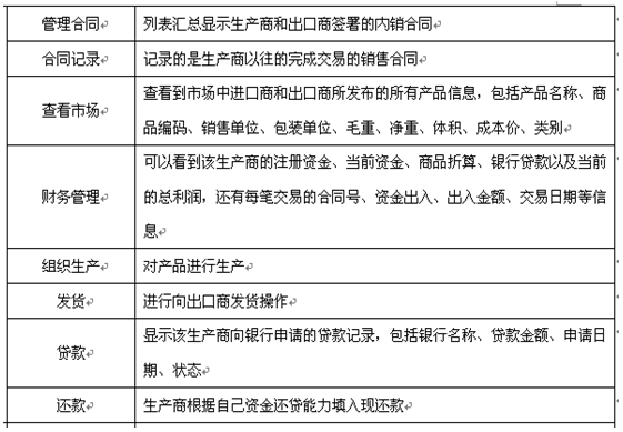 7、可以配置進(jin)口(kou)(kou)商(shang)(shang)、出(chu)(chu)口(kou)(kou)商(shang)(shang)、進(jin)口(kou)(kou)地銀行(xing)(xing)、出(chu)(chu)口(kou)(kou)地銀行(xing)(xing)、國稅局(ju)(ju)(ju)、海關(guan)、商(shang)(shang)檢局(ju)(ju)(ju)、保(bao)險公(gong)(gong)司、貨代(dai)(dai)公(gong)(gong)司、外(wai)匯(hui)管理局(ju)(ju)(ju)等相關(guan)參數和業務,在(zai)實訓過程中可以分組、分角(jiao)色進(jin)行(xing)(xing)互動、交互式訓練(lian)。角(jiao)色扮演:出(chu)(chu)口(kou)(kou)商(shang)(shang)、進(jin)口(kou)(kou)商(shang)(shang)、生(sheng)產商(shang)(shang)(工廠)、進(jin)口(kou)(kou)銀行(xing)(xing)、出(chu)(chu)口(kou)(kou)銀行(xing)(xing)、保(bao)險公(gong)(gong)司、商(shang)(shang)檢局(ju)(ju)(ju)、海關(guan)、外(wai)匯(hui)管理局(ju)(ju)(ju)、貨代(dai)(dai)、國稅局(ju)(ju)(ju)