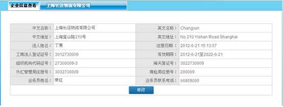 企業信息(xi)(xi)顯示的是貨(huo)代(dai)公司的基本信息(xi)(xi),包括貨(huo)代(dai)公司注冊(ce)時添加的信息(xi)(xi)和注冊(ce)完成后自動生(sheng)成的信息(xi)(xi)。