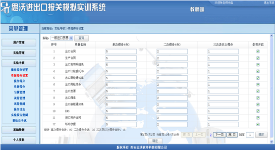 5、軟件分(fen)為(wei)管理員(yuan)、教(jiao)(jiao)師、學(xue)生三種用(yong)戶(hu)權限(xian),管理員(yuan)端(duan)(duan)主要功能是(shi)設置教(jiao)(jiao)師用(yong)戶(hu)以及數(shu)據的(de)維護。教(jiao)(jiao)師端(duan)(duan)主要負責管理學(xue)生用(yong)戶(hu)信(xin)息、設置學(xue)生實(shi)驗任(ren)務、維護實(shi)驗基(ji)礎(chu)數(shu)據、對學(xue)生實(shi)驗情況進行考核。學(xue)生端(duan)(duan)根(gen)據布置的(de)實(shi)驗任(ren)務,完成實(shi)驗任(ren)務,熟悉報(bao)關相關規范(fan)、掌(zhang)握報(bao)關業務流程以及單(dan)據的(de)填制。