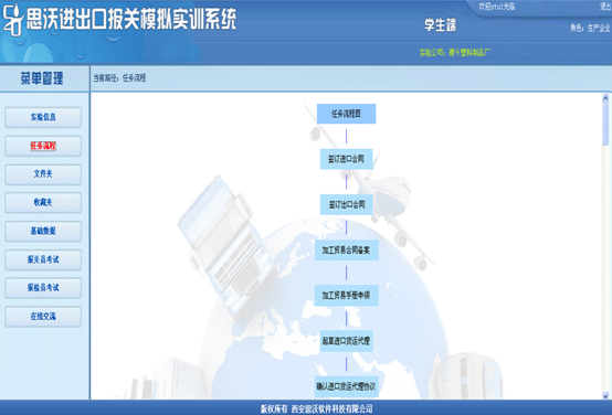9、角(jiao)(jiao)色(se)介紹:學(xue)生(sheng)端角(jiao)(jiao)色(se)分(fen)為外貿公司、生(sheng)產企業、貨代公司、報關行(xing),各角(jiao)(jiao)色(se)的功能模塊相同(tong)(tong),但具體的功能和(he)需要(yao)完成(cheng)的任務不同(tong)(tong)。各角(jiao)(jiao)色(se)相互(hu)配合(he),分(fen)工合(he)作(zuo),共同(tong)(tong)完成(cheng)實驗業務流程。