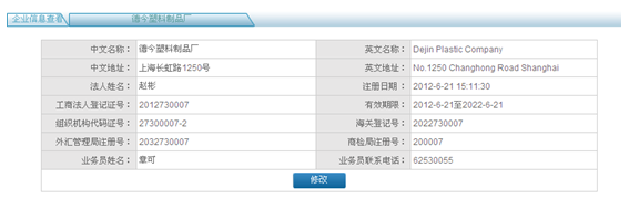 企(qi)業信息(xi)中(zhong)工(gong)商法(fa)人登記證(zheng)號、組織機構代碼證(zheng)號、外匯管理局(ju)注(zhu)冊(ce)號、有效期限、海關登記號和商檢局(ju)注(zhu)冊(ce)號在企(qi)業注(zhu)冊(ce)完成(cheng)后自(zi)動生成(cheng)。