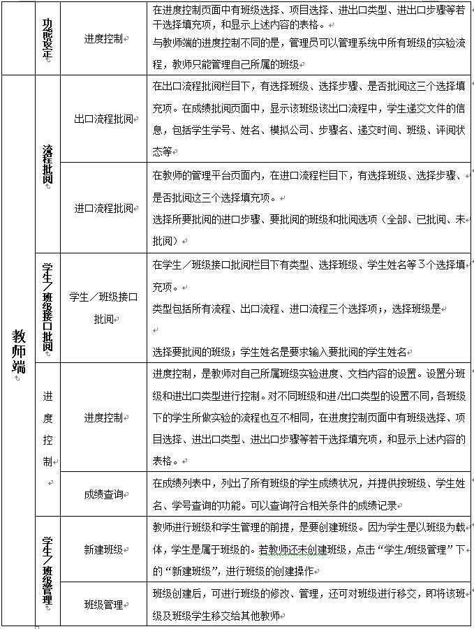 2.權(quan)限(xian)分(fen)(fen)為管(guan)理員(yuan)、教(jiao)師(shi)和學(xue)生,其中學(xue)生端(duan)(duan)在(zai)首頁以出口流(liu)程(cheng)、進(jin)口流(liu)程(cheng)、資費信息、幫助(zhu)、注冊(ce)等(deng)(deng)模塊(kuai)顯示。教(jiao)師(shi)通過兩個(ge)權(quan)限(xian)對(dui)用戶、實驗基礎數據、實驗進(jin)程(cheng)等(deng)(deng)方面(mian)進(jin)行有效的管(guan)理。教(jiao)師(shi)通過系統中的獨立端(duan)(duan)口對(dui)班級學(xue)生進(jin)行管(guan)理,可(ke)對(dui)學(xue)生所需(xu)實驗步驟進(jin)行分(fen)(fen)步開放操(cao)作(zuo)權(quan)限(xian)。教(jiao)師(shi)也可(ke)根據自己所總結(jie)的案例(li)或者典(dian)型的案例(li)在(zai)管(guan)理員(yuan)端(duan)(duan)口進(jin)行添加,操(cao)作(zuo)簡單、方便。