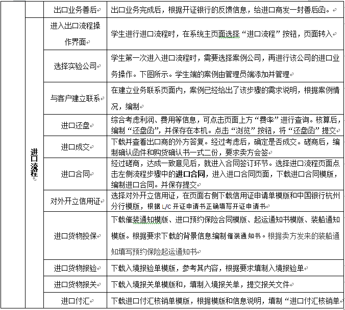 4.進(jin)口流(liu)程(cheng)包含選擇實(shi)驗公司、與(yu)客戶建立聯系(xi)、出(chu)(chu)口報(bao)價及(ji)發盤、出(chu)(chu)口還價核算及(ji)發盤、出(chu)(chu)口成(cheng)交核算、出(chu)(chu)口合同(tong)簽訂(ding)、信(xin)用證審核、信(xin)用證修改函、出(chu)(chu)口貨(huo)運(yun)訂(ding)艙、出(chu)(chu)口貨(huo)物投(tou)保、出(chu)(chu)口貨(huo)物報(bao)檢、出(chu)(chu)口貨(huo)物報(bao)關、出(chu)(chu)口制單結(jie)匯(hui)和(he)(he)出(chu)(chu)口業(ye)務(wu)善后等內容。軟件(jian)內容注重(zhong)實(shi)務(wu)操作,它針(zhen)對外貿業(ye)務(wu)的(de)實(shi)踐(jian)性(xing)和(he)(he)適時性(xing),通(tong)過(guo)各(ge)種案例加深對國際(ji)貿易(yi)各(ge)種慣例及(ji)法律法規(gui)、業(ye)務(wu)規(gui)范的(de)理(li)解和(he)(he)記憶。