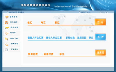 《思沃國(guo)(guo)際(ji)結(jie)(jie)算(suan)模(mo)(mo)擬(ni)實訓系(xi)統》從高校國(guo)(guo)際(ji)結(jie)(jie)算(suan)教學(xue)的(de)(de)實際(ji)需(xu)求(qiu)出(chu)發,主要(yao)從匯(hui)付、托收(shou)、信用證三(san)種(zhong)不同(tong)類型的(de)(de)結(jie)(jie)算(suan)方式,本(ben)教學(xue)平臺(tai)軟件逼真地(di)模(mo)(mo)擬(ni)了出(chu)口商(shang)、進口商(shang)、匯(hui)入行、匯(hui)出(chu)行等角色的(de)(de)辦事流程。