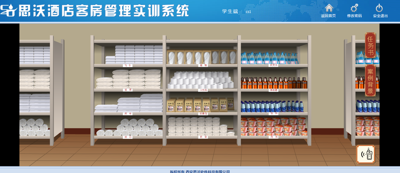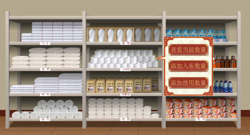 學生端包含布草(cao)間(jian)管理場景模擬,學生模擬工作人員(yuan)通過動畫場景互動對(dui)布草(cao)間(jian)進(jin)行管理操作。并可查看床單、被罩、枕(zhen)套、浴巾(jin)、毛巾(jin)、洗漱包、洗發水等(deng)消耗物(wu)品(pin)的庫存數量,并判(pan)斷是否(fou)補(bu)充。