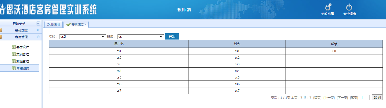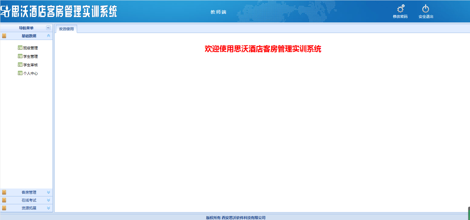 教(jiao)師登陸界面(mian):基礎(chu)數(shu)據、客房(fang)管理,在線考試,資(zi)源拓展(zhan)每個大模塊(kuai)下分別有(you)相應的子模塊(kuai)。