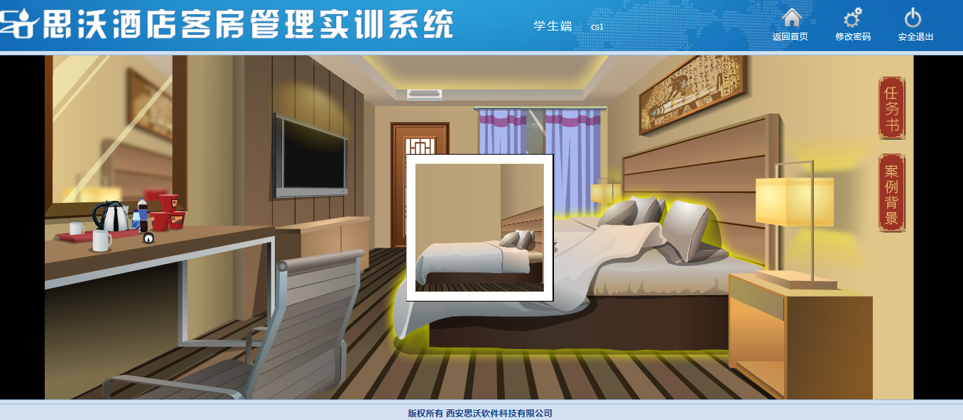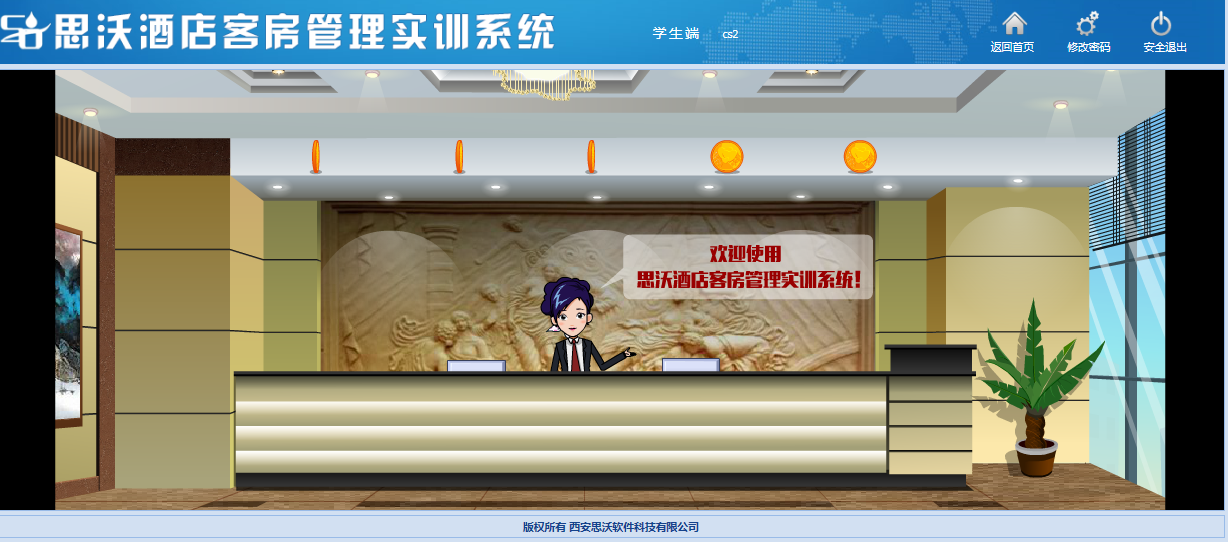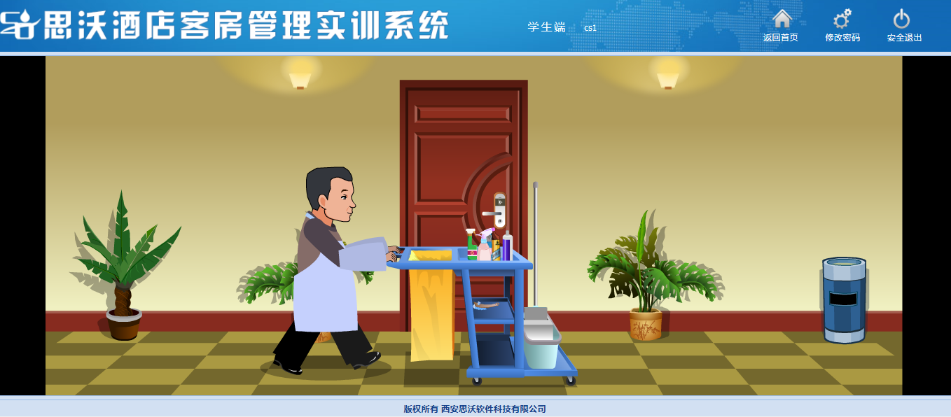 系(xi)統(tong)以flash動畫模擬酒店情景(jing),學生進入進行模擬客(ke)房(fang)(fang)管理(li)日常(chang)事務處理(li),包(bao)括客(ke)房(fang)(fang)設計、引領入住、客(ke)房(fang)(fang)查房(fang)(fang)、客(ke)房(fang)(fang)整(zheng)理(li)、布草(cao)間等類型(xing)實訓(xun)。