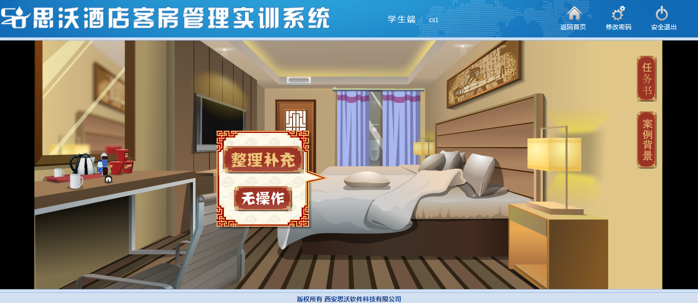 該教學(xue)(xue)軟件平(ping)臺(tai)模(mo)擬(ni)客(ke)房場(chang)(chang)景,學(xue)(xue)生通過(guo)(guo)(guo)場(chang)(chang)景互(hu)動進行(xing)模(mo)擬(ni)操作,包(bao)含任務(wu)書、案例背景等,學(xue)(xue)生在操作過(guo)(guo)(guo)程中(zhong)可(ke)隨時查看進度(du)。學(xue)(xue)生通過(guo)(guo)(guo)該教學(xue)(xue)軟件平(ping)臺(tai)的虛擬(ni)場(chang)(chang)景中(zhong)可(ke)對床(chuang)上(shang)用(yong)品、窗(chuang)簾(lian)、電器、桌(zhuo)椅、茶幾上(shang)的消(xiao)費商品、洗漱臺(tai)、馬桶、浴(yu)室等進行(xing)整理操作。