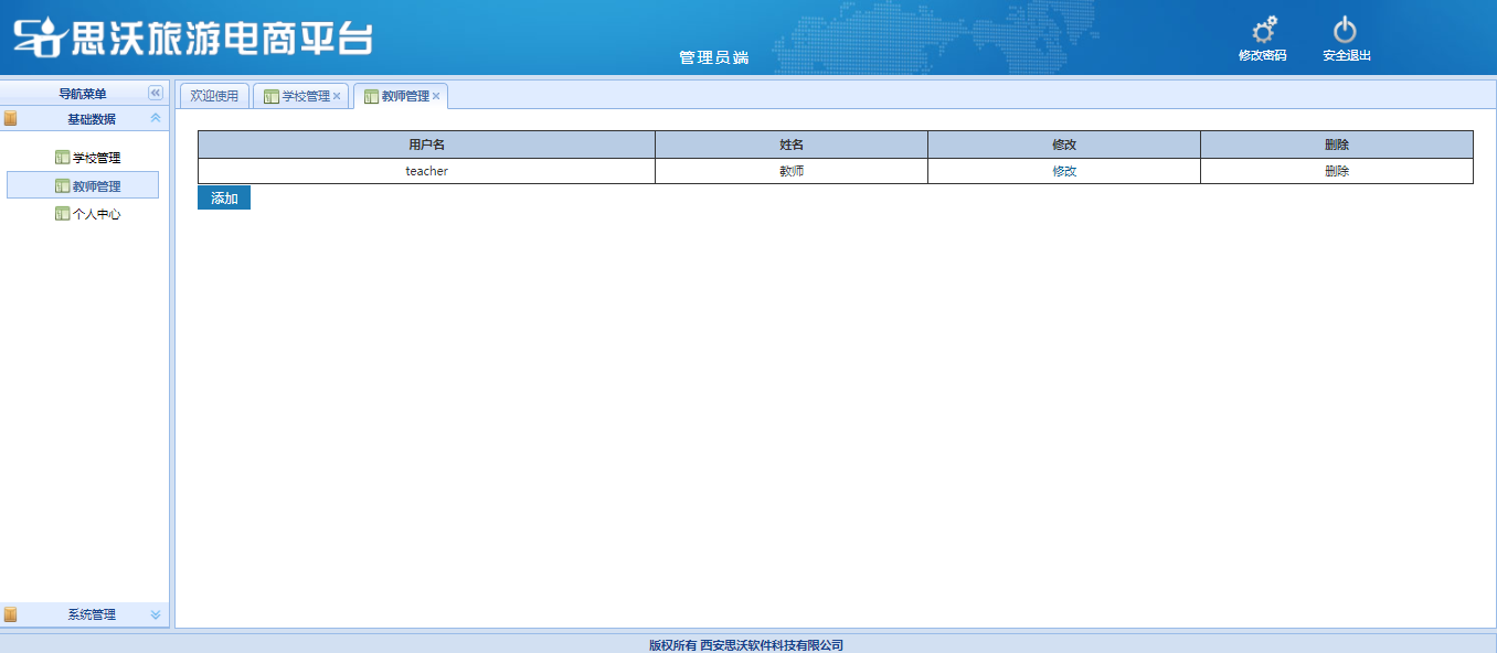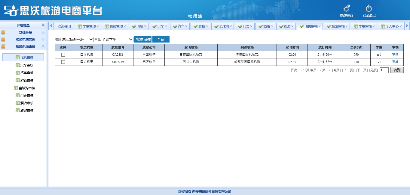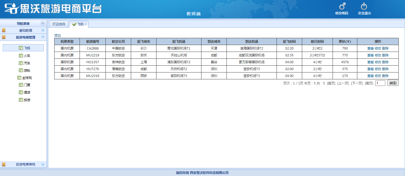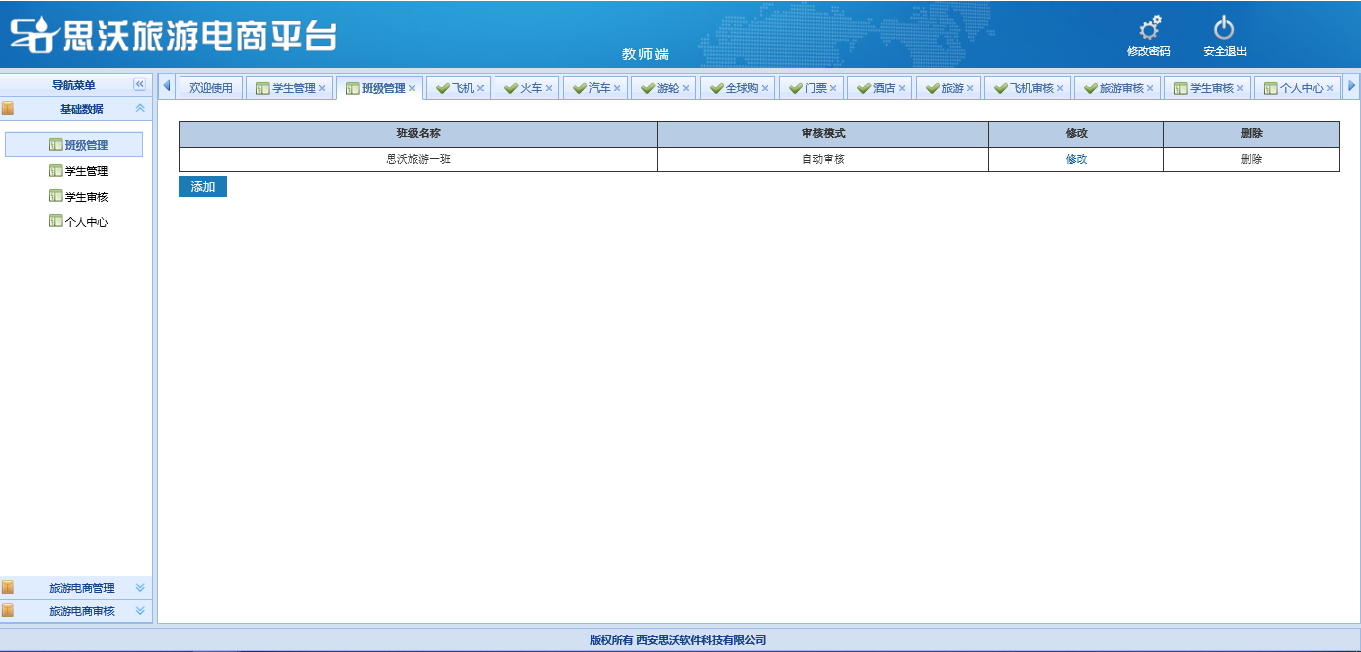 教師端包括:基礎數據(班(ban)級(ji)管(guan)理(li)(li)(li)、學(xue)生(sheng)管(guan)理(li)(li)(li)、學(xue)生(sheng)審(shen)(shen)(shen)核、個人信(xin)(xin)息);旅(lv)游電商管(guan)理(li)(li)(li)(對(dui)學(xue)生(sheng)發布已審(shen)(shen)(shen)核的飛(fei)機、火(huo)車、汽車、游輪、全(quan)球購、門票(piao)、酒店、旅(lv)游產品信(xin)(xin)息進(jin)行管(guan)理(li)(li)(li));旅(lv)游電商審(shen)(shen)(shen)核(對(dui)學(xue)生(sheng)發布的飛(fei)機、火(huo)車、汽車、游輪、全(quan)球購、門票(piao)、酒店、旅(lv)游產品信(xin)(xin)息進(jin)行進(jin)行審(shen)(shen)(shen)核)。