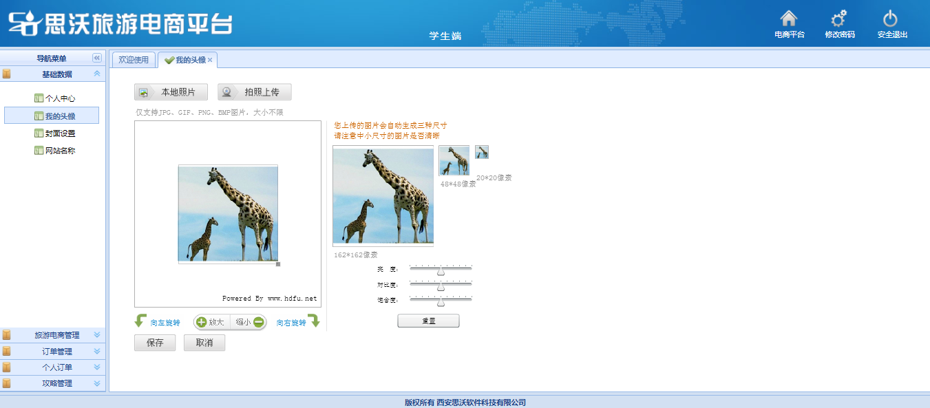 學生后臺網站頁面個性化操(cao)作,可通過攝像頭(tou)(tou)等設(she)備進行頭(tou)(tou)像拍照上傳、也可上傳本(ben)地(di)照片,行網站名稱及(ji)封(feng)面設(she)置。并進行飛機、火車、汽車、游(you)(you)輪、全球購、門票、酒店、旅(lv)(lv)游(you)(you)產品、旅(lv)(lv)游(you)(you)攻略等信息(xi)添加發布。