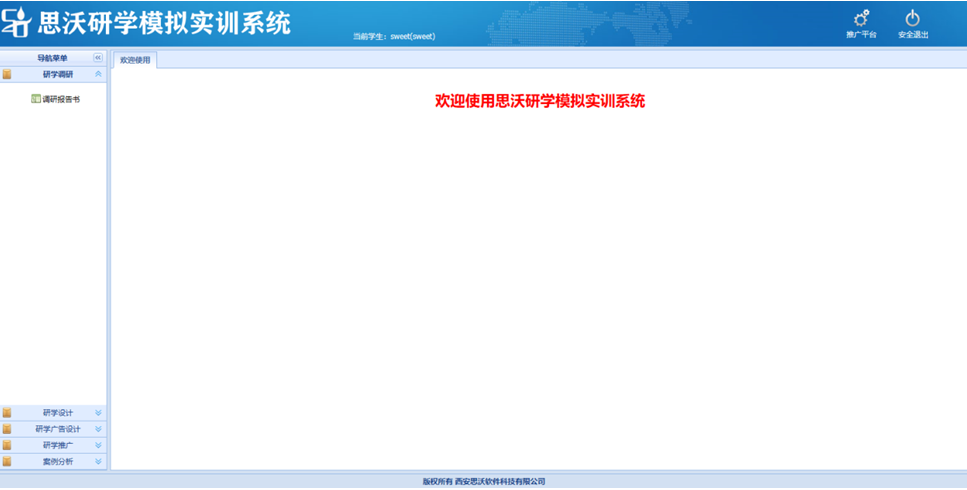 思沃研(yan)(yan)學(xue)(xue)(xue)模(mo)(mo)(mo)擬實訓系統分(fen)(fen)為管(guan)理員,教師,學(xue)(xue)(xue)生三種角(jiao)色,功(gong)能包括推廣(guang)(guang)平臺、首(shou)頁(ye),知識庫(ku),研(yan)(yan)學(xue)(xue)(xue)推廣(guang)(guang),圖文結合廣(guang)(guang)告(gao),媒體推送廣(guang)(guang)告(gao),研(yan)(yan)學(xue)(xue)(xue)調研(yan)(yan),研(yan)(yan)學(xue)(xue)(xue)設(she)計(ji)等(deng)。學(xue)(xue)(xue)生通過模(mo)(mo)(mo)擬實訓體驗從研(yan)(yan)學(xue)(xue)(xue)內(nei)容調研(yan)(yan)、研(yan)(yan)學(xue)(xue)(xue)路線(xian)設(she)計(ji)、研(yan)(yan)學(xue)(xue)(xue)核心價值發掘、研(yan)(yan)學(xue)(xue)(xue)媒體網絡(luo)推廣(guang)(guang)等(deng)一系列工作內(nei)容。 研(yan)(yan)學(xue)(xue)(xue)軟件包含案例(li)分(fen)(fen)析,點(dian)評(ping),研(yan)(yan)學(xue)(xue)(xue)線(xian)路設(she)計(ji),團(tuan)隊類(lei)(lei)(lei)型(xing),機型(xing),小交通標(biao)準(zhun),出(chu)入(ru)境(jing)口岸,匯率維(wei)護,酒店類(lei)(lei)(lei)型(xing),研(yan)(yan)學(xue)(xue)(xue)類(lei)(lei)(lei)型(xing)知識庫(ku)類(lei)(lei)(lei)型(xing),案例(li)類(lei)(lei)(lei)型(xing),航(hang)空公(gong)司(si),線(xian)路區域,團(tuan)隊等(deng)級,住宿(su)標(biao)準(zhun),大交通標(biao)準(zhun),門票標(biao)準(zhun),餐飲(yin)標(biao)準(zhun),導(dao)游證(zheng)類(lei)(lei)(lei)別,酒店等(deng)級,客戶行業分(fen)(fen)類(lei)(lei)(lei),客戶等(deng)級分(fen)(fen)類(lei)(lei)(lei),客戶關系深度(du),地接(jie)車等(deng)級,客戶接(jie)受程度(du),國家維(wei)護,省份維(wei)護,城市(shi)維(wei)護,景點(dian)類(lei)(lei)(lei)型(xing),學(xue)(xue)(xue)生可以進行系統的模(mo)(mo)(mo)擬學(xue)(xue)(xue)習。
