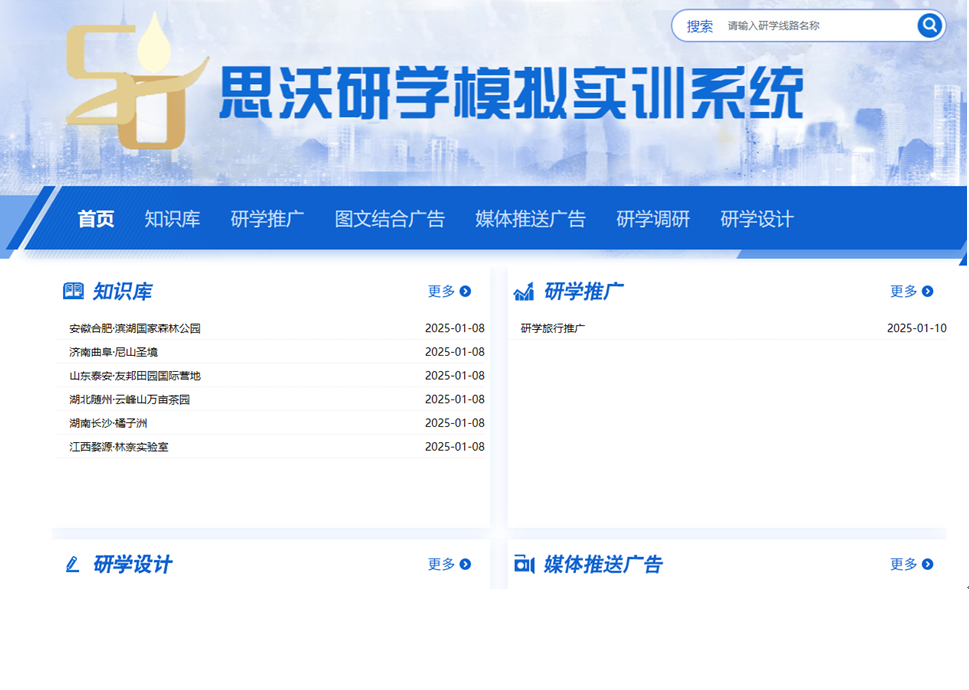 推廣(guang)平臺包括首頁,知識庫,研學推廣(guang),圖文結合(he)廣(guang)告,媒體推送廣(guang)告,研學調(diao)研,研學設計等模塊。