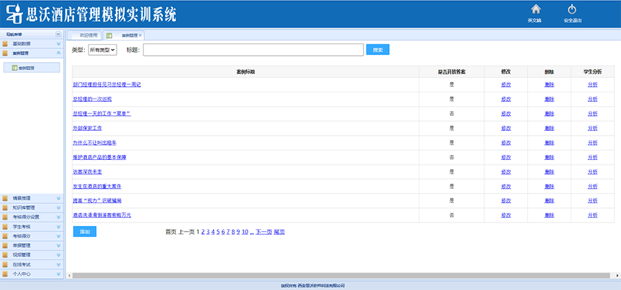 在(zai)線考(kao)(kao)試模(mo)塊,可創(chuang)建、發布、預覽考(kao)(kao)試試卷,設置(zhi)(zhi)考(kao)(kao)試時間、規則等(deng),自動生成考(kao)(kao)試成績,統計考(kao)(kao)試結果。教師可以自主添(tian)加、修改(gai)、刪(shan)除(chu)、預覽、導入題(ti)(ti)(ti)目,題(ti)(ti)(ti)庫內置(zhi)(zhi)1400+試題(ti)(ti)(ti),題(ti)(ti)(ti)型豐富,分為(wei)判斷(duan)題(ti)(ti)(ti)、單選(xuan)題(ti)(ti)(ti)、多選(xuan)題(ti)(ti)(ti)、填(tian)空題(ti)(ti)(ti)、問答(da)題(ti)(ti)(ti)、論(lun)述題(ti)(ti)(ti)、名(ming)詞解釋(shi)等(deng)。 題(ti)(ti)(ti)庫涵蓋酒店運營管(guan)理各關鍵環節,從(cong)餐飲服務(wu)到客房(fang)管(guan)理,從(cong)市場營銷到人員培訓,旨在(zai)全(quan)面(mian)考(kao)(kao)查(cha)從(cong)業(ye)者對(dui)酒店管(guan)理知識(shi)的掌(zhang)握程度。