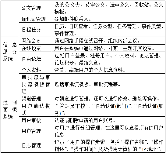 你(ni)可以(yi)向(xiang)公(gong)共(gong)信(xin)息欄(lan)內(nei)發布新(xin)聞(wen)、通知……其他用(yong)戶可及(ji)時瀏(liu)覽最新(xin)信(xin)息。“我的辦(ban)公(gong)室”模塊,你(ni)可以(yi)輕(qing)松管理各類型文(wen)(wen)檔資料;郵件系(xi)統方(fang)便了與其他人(ren)員的聯系(xi);公(gong)文(wen)(wen)辦(ban)理是(shi)(shi)辦(ban)公(gong)系(xi)統的重點,公(gong)文(wen)(wen)審(shen)批流(liu)(liu)程將在此(ci)進行;通訊錄(lu)讓你(ni)輕(qing)松查閱需要的聯系(xi)方(fang)式。“日(ri)志任務”模塊是(shi)(shi)個人(ren)事(shi)務計劃和實(shi)施的小秘書,提醒你(ni)待辦(ban)公(gong)文(wen)(wen)和待辦(ban)事(shi)件。你(ni)可以(yi)在線與其他成員交(jiao)流(liu)(liu),或者(zhe)進行網絡會議、在線投票及(ji)自(zi)由討(tao)論。