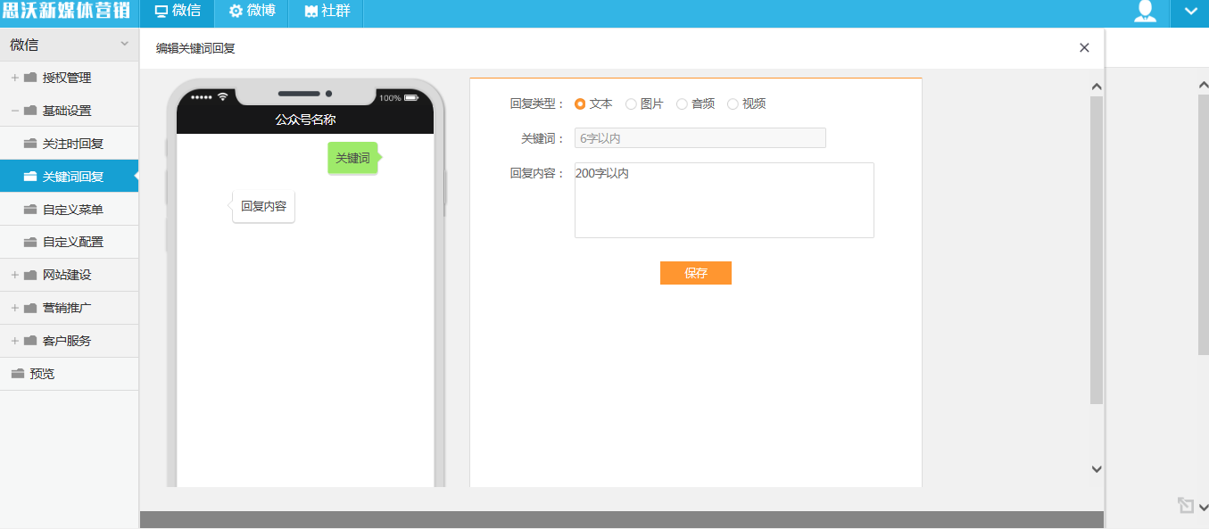 學生微信營銷基礎設置中可設置關注時回復、關鍵詞回復、自定義菜單、自定義配置相關內容,關注時回復可設置文本、圖文、多圖文內容;關鍵詞回復可設置文本、圖片、音頻、視頻等回復類型。