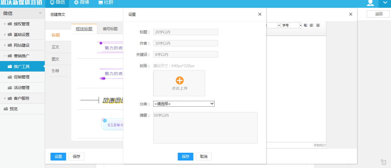 系統微信營銷推廣中可完成推文管理和調研表單實訓。推文管理中先創建分類,即可完成推文的整體設置,包括標題(選擇框線標題、編號標題、圖片標題等樣式,并設置作者、關鍵詞、封面、摘要等內容)、正文(邊框內容、段落文字、引用)、圖文(單圖文、多圖文、上下圖文、左右圖文)、引導(分割線、頂部關注、二維碼)內容。調研表單中可設置標題、關鍵詞、回復圖片、調研說明、活動開始和結束時間。