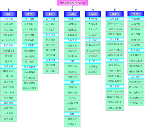 思(si)沃會展(zhan)營(ying)銷模擬實(shi)(shi)訓系統(tong)以模擬會展(zhan)公司的(de)(de)(de)(de)策劃(hua)部(bu)(bu)、外聯部(bu)(bu)、招商(shang)部(bu)(bu)、會展(zhan)服(fu)(fu)務(wu)(wu)(wu)(wu)部(bu)(bu)、人事部(bu)(bu)、財(cai)務(wu)(wu)(wu)(wu)部(bu)(bu)以及(ji)總經辦(ban)7大業(ye)(ye)務(wu)(wu)(wu)(wu)部(bu)(bu)門為(wei)基礎而展(zhan)開(kai)實(shi)(shi)驗(yan)操(cao)作(zuo)(zuo)的(de)(de)(de)(de)。該教學(xue)(xue)平(ping)臺軟件(jian)業(ye)(ye)務(wu)(wu)(wu)(wu)內容(rong)包括(kuo)了(le):項(xiang)目上報審批、項(xiang)目的(de)(de)(de)(de)策劃(hua)安排、服(fu)(fu)務(wu)(wu)(wu)(wu)商(shang)管(guan)理、人事招聘與(yu)(yu)管(guan)理、會展(zhan)的(de)(de)(de)(de)現場(chang)服(fu)(fu)務(wu)(wu)(wu)(wu)與(yu)(yu)合同(tong)管(guan)理等(deng)等(deng),讓學(xue)(xue)生(sheng)通過實(shi)(shi)驗(yan)感受會展(zhan)項(xiang)目的(de)(de)(de)(de)系統(tong)化管(guan)理流(liu)程與(yu)(yu)業(ye)(ye)務(wu)(wu)(wu)(wu)操(cao)作(zuo)(zuo)內容(rong),不但(dan)能夠了(le)解會展(zhan)項(xiang)目從立項(xiang)審批到策劃(hua)、宣傳、招展(zhan)招商(shang)、現場(chang)服(fu)(fu)務(wu)(wu)(wu)(wu)以及(ji)會后(hou)(hou)總結各(ge)個環(huan)節的(de)(de)(de)(de)業(ye)(ye)務(wu)(wu)(wu)(wu),同(tong)時還可(ke)以掌握(wo)各(ge)種文案的(de)(de)(de)(de)寫(xie)作(zuo)(zuo)技巧,從而讓學(xue)(xue)生(sheng)真(zhen)正的(de)(de)(de)(de)理解并掌握(wo)會展(zhan)這一行業(ye)(ye)的(de)(de)(de)(de)各(ge)種知(zhi)識(shi)與(yu)(yu)業(ye)(ye)務(wu)(wu)(wu)(wu)要求。為(wei)學(xue)(xue)生(sheng)以后(hou)(hou)的(de)(de)(de)(de)工(gong)作(zuo)(zuo)、學(xue)(xue)習提供了(le)一個實(shi)(shi)戰演(yan)練的(de)(de)(de)(de)實(shi)(shi)訓平(ping)臺,增強了(le)學(xue)(xue)生(sheng)進入工(gong)作(zuo)(zuo)崗位后(hou)(hou)的(de)(de)(de)(de)實(shi)(shi)力。