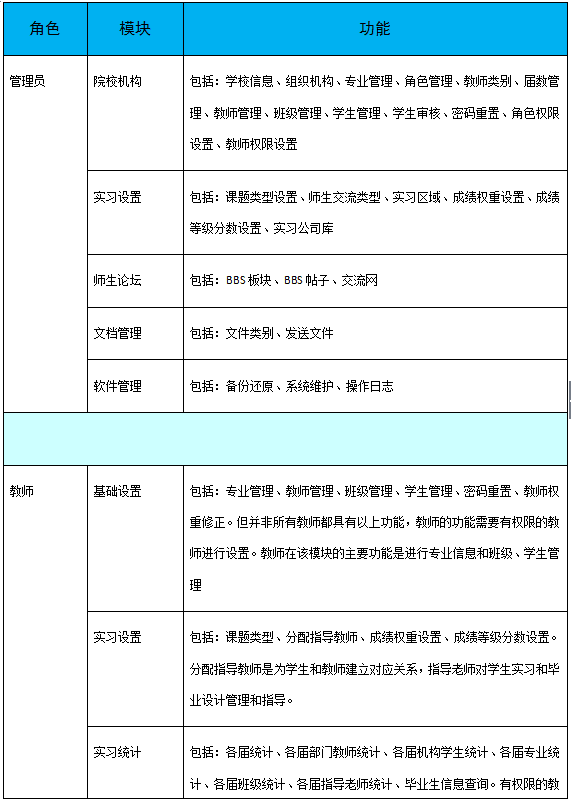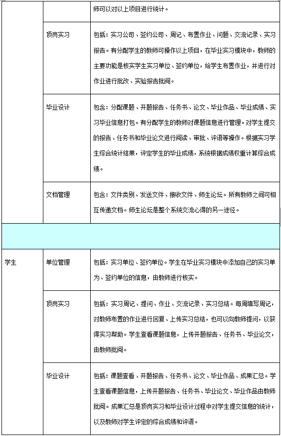 軟件按管(guan)理(li)員、教(jiao)(jiao)師(shi)、學生(sheng)(sheng)分(fen)為三種用戶(hu)權限(xian)(xian)。其中(zhong),管(guan)理(li)員設置(zhi)(zhi)軟件基礎信息,包括:學校信息、院(yuan)校組(zu)織機構(gou)、屆數年份管(guan)理(li)、教(jiao)(jiao)師(shi)類別、權限(xian)(xian)管(guan)理(li)等(deng)。教(jiao)(jiao)師(shi)根據權限(xian)(xian)不(bu)(bu)同,功(gong)能模塊不(bu)(bu)同,只有(you)開通了權限(xian)(xian)的(de)(de)教(jiao)(jiao)師(shi)可操(cao)作相應(ying)的(de)(de)功(gong)能。教(jiao)(jiao)師(shi)角色(se)的(de)(de)主要模塊包括:系統(tong)設置(zhi)(zhi)、統(tong)計(ji)查(cha)看、畢(bi)業實(shi)(shi)習(xi)、畢(bi)業設計(ji)、成(cheng)績管(guan)理(li)、輔(fu)助工具(ju)。學生(sheng)(sheng)在(zai)實(shi)(shi)習(xi)期間,應(ying)按時填寫周記(ji),完成(cheng)教(jiao)(jiao)師(shi)的(de)(de)作業,在(zai)有(you)疑問(wen)時還(huan)可以向教(jiao)(jiao)師(shi)提問(wen)。學生(sheng)(sheng)端的(de)(de)主要模塊有(you):畢(bi)業實(shi)(shi)習(xi)匯總、畢(bi)業實(shi)(shi)習(xi)、畢(bi)業設計(ji)、成(cheng)績查(cha)看、輔(fu)助工具(ju)