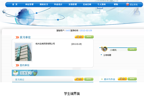 軟件根據現實(shi)(shi)院(yuan)(yuan)校(xiao)(xiao)(xiao)實(shi)(shi)習(xi)(xi)和畢(bi)(bi)業(ye)設(she)計過程涉及(ji)到的環節和內容進(jin)(jin)行設(she)計。管理(li)(li)員端(duan)主要設(she)置(zhi)院(yuan)(yuan)校(xiao)(xiao)(xiao)的基礎(chu)信息(學(xue)(xue)校(xiao)(xiao)(xiao)信息、組(zu)織機構(gou)、專(zhuan)業(ye)管理(li)(li)、角色管理(li)(li)、教(jiao)(jiao)師(shi)(shi)(shi)(shi)類別、屆數管理(li)(li)等(deng)),給各院(yuan)(yuan)系教(jiao)(jiao)師(shi)(shi)(shi)(shi)分(fen)配權(quan)限(xian),以便各教(jiao)(jiao)師(shi)(shi)(shi)(shi)進(jin)(jin)入管理(li)(li)和指導所在(zai)機構(gou)下的學(xue)(xue)生(sheng)(sheng)。教(jiao)(jiao)師(shi)(shi)(shi)(shi)端(duan)根據管理(li)(li)員分(fen)配的權(quan)限(xian)進(jin)(jin)行操作,教(jiao)(jiao)師(shi)(shi)(shi)(shi)給學(xue)(xue)生(sheng)(sheng)分(fen)配指導老師(shi)(shi)(shi)(shi),為學(xue)(xue)生(sheng)(sheng)和教(jiao)(jiao)師(shi)(shi)(shi)(shi)之間建立對應關系。老師(shi)(shi)(shi)(shi)可以對學(xue)(xue)生(sheng)(sheng)布置(zhi)作業(ye),分(fen)配課題,為學(xue)(xue)生(sheng)(sheng)的提問作解答,查(cha)閱(yue)學(xue)(xue)生(sheng)(sheng)的周(zhou)記、實(shi)(shi)習(xi)(xi)報告以及(ji)學(xue)(xue)生(sheng)(sheng)實(shi)(shi)習(xi)(xi)簽約情況。學(xue)(xue)生(sheng)(sheng)提交實(shi)(shi)習(xi)(xi)和簽約單位,向提交周(zhou)記、作業(ye)、實(shi)(shi)習(xi)(xi)總結(jie)(jie)、畢(bi)(bi)業(ye)設(she)計,實(shi)(shi)習(xi)(xi)中遇到問題可以通(tong)過提問和互動空間進(jin)(jin)行交流和總結(jie)(jie)